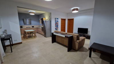 The property is fully air-conditioned and fully equipped and it consists of a large open plan kitchen, dining and living area, 2 bedrooms (main with en-suite), the 3rd bedroom was converted to a fully furnished office, main bathroom and a front and back terrace.